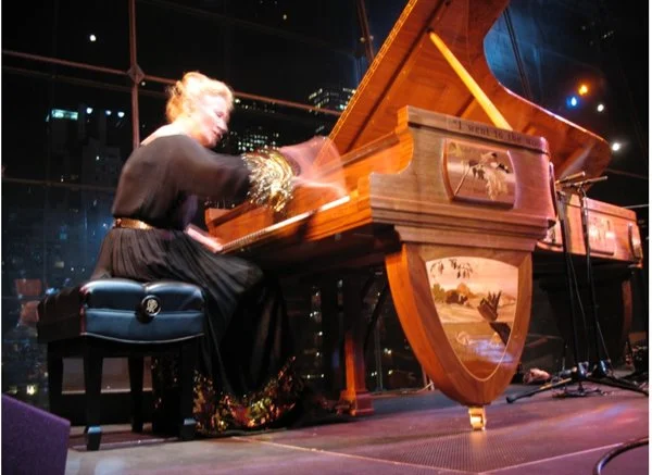 As time went on and she resumed her career, some interesting opportunities arose. In 1996 she performed at the Kennedy Center’s 25th Anniversary Gala Concert, broadcast on PBS. In 2003 she was one of 23 Steinway Hall of Legends pianists honored in a publication commemorating the piano maker’s 150th anniversary, alongside such notables as Van Cliburn, Harry Connick, Jr., Herbie Hancock, Duke Ellington, Sergei Rachmaninoff, Randy Newman and Billy Joel. In 2007, at the invitation of Don Henley, she took the stage at Jazz at Lincoln Center with The Eagles and Billy Joel, to perform on the Walden Woods Steinway, an instrument created by craftsmen from wood gathered from around Walden Pond. The benefit concert before a star-studded audience raised funds to rescue 150 acres of Thoreau’s iconic woodland from a planned housing development. Barbara Nissman’s autograph appears on the plate of this $500,000 Steinway, alongside those of other artists who have played it: Elton John, Dave Brubeck, Bruce Hornsby, Emmanuel Ax, Billy Joel and Herbie Hancock.