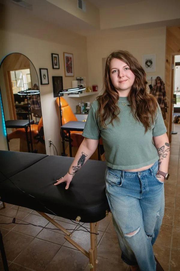 Black Possum Ink owner and hand poked tattoo artist Kristen Rehak started her tattooing journey on a whim, finding a way for more self-expression and originality in her art. Kristen enjoys the process more than machine tattooing, allowing her more control over the end product. Taking inspiration anywhere, she offers custom and premade flash tattoos of her own designs, including themed flash collections corresponding with social or political issues, using them as a fundraising opportunity toward a cause or organization. Her style is constantly evolving, changing as she grows as an artist. “I primarily do a lot of graphic line work, and I like to incorporate some old school traditional tattoo elements and themes into my flash because I love traditional style tattoos,” Kristen says. Collaborating and connecting with clients is a highlight for her, even as she jokes—and her business name pays homage to—the idea she’s the black sheep of the local tattoo community. “When people approach me with ideas and they want something in my style or to make an idea my own, those projects end up being the best. I get to create some original artwork, and the client gets to see their idea come to life,” Kristen says. “I try to incorporate my own style into most projects, even if it’s just adding or changing a few details; I want designs to be unique in some kind of way for my clients. Luckily, most people want unique tattoos—people want to know their tattoos are special and handmade for them.”