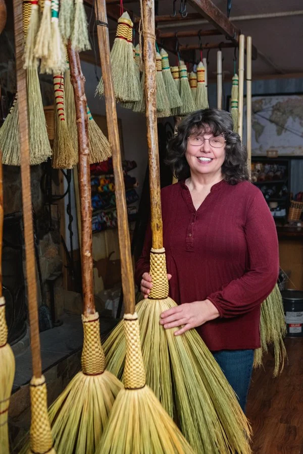 Brenda Harmon, owner of BrenWood Forge and Broom, began her craft when her husband, a blacksmith, needed a broom to go with a fireplace tool set he’d made. Everything snowballed from there. “I purchased a broom at a flea market, tore it apart and figured out how to make it basically by trial and error,” Brenda says. Making brooms as a business for just shy of 20 years, Brenda took classes at the John C. Campbell Folk School. “I was able to be creative, and it complimented my husband’s iron work,” she says. “We started doing craft shows and events, and that’s where we started to build our business.” Harvesting some broom making material from the woods, Brenda also uses nylon twine and broom corn from Mexico and practices techniques from days of old. “I use better materials in this day and age, but I use the same process of hand tying the broom like they did in the late 1700s with a foot pedal,” she says. “The brooms I make are from prior to that industrial revolution. The brooms I make just have such a warm, good feel to them that they’re beautiful to look at, they’re fun to use. They make it so I enjoy sweeping. It’s just a homey, feel good feeling to use.” In addition to traditional brooms that are as beautiful as they are practical, Brenda makes and sells pot scrubbers, percussion brushes, holy water sprinklers, and much more, shipping all over the world.