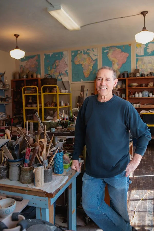Clay sculptor Sean O’Connell has been making objects all his life, exploring a wide range of interests and ways to work. Changing careers from a carpenter and woodworker to further explore art, he moved to West Virginia in 2013 after studying ceramics in upstate New York. He now operates Jumping Branch Clayworks at Lee Street Studios. “Sculpture was my basis,” Sean says. “I have an affinity for wood, so I started mixing the wood elements with the clay elements and creating these totemic mixed media sculptures.” He’s also always been drawn to the non-industrial energy of cultures that work with clay or wood as a means of expression symbolically. “I like masks,” Sean says. “I like work of Africa, India, China, Japan, New Zealand. The Maori work is incredible. So I’m influenced by all that. I like the idea that you can see the hand of the maker in whatever I make.” West Virginia and Appalachian traditions of pottery are primarily functional, and Sean’s wheel work has a basis here, blending with the figurative work he brings to the table. Each piece he creates is an individual, with a nearly tangible freshness and energy. “I’m not interested in making tight ceramic wear that competes with mass produced, machine made work. I think in this day and age, we appreciate the touch of the human, and that’s one theme that flows through everything I do: that idea of the human maker, the human hand in the creations of history and the world.”